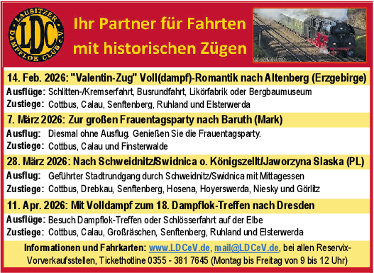 Richtig: Der Internationale Frauentag ist natürlich am 8. März. Der Frauentagsparty-Express „Einsteiger“ vom Lausitzer Dampflok-Club macht sich dennoch schon einen Tag früher auf den Schienenweg nach Baruth (Mark). Denn dort wird speziell für die Ladys an Bord am Sonnabend, 7. März, die „Lieblingsschlager-Nacht“ inklusive Newcomer-Award 2026 gefeiert. Sechs aufgehende Schlagersterne haben sich in einem Online-Vorentscheid für das Finale qualifiziert. Für sie geht es nun live um die Gunst des Publikums und um Wertungspunkte der hochkarätig besetzten Fachjury: Maria Winter (Award-Gewinnerin 2025), das Duo Vintos, Mickie-Krause-Double (Foto) und Denny Schönemann. Natürlich sorgen die Jury-Mitglieder im Laufe des Abends auch höchstselbst für Stimmung. Mehr Infos: www.ldcev.de