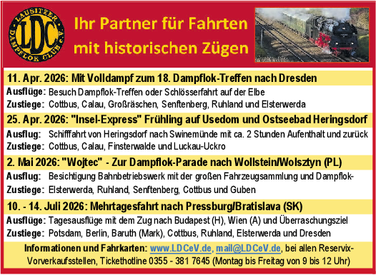 Die Sonderzugfahrten des Lausitzer Dampflok-Club verbinden Eisenbahn-Nostalgie mit dem Entdecken attraktiver Reiseziele und dem Erleben einst revolutionärer Technik. So auch am 2. Mai dieses Jahres, wenn der historische Sonderzug „Wojtek“ am Haken eines kraftstrotzenden Schienen-Oldtimers zur Dampflok-Parade nach Wolsztyn ins benachbarte Polen rollt: Wer schon einmal da war, versteht, dass die Schau ein Muss für Eisenbahnfans ist!