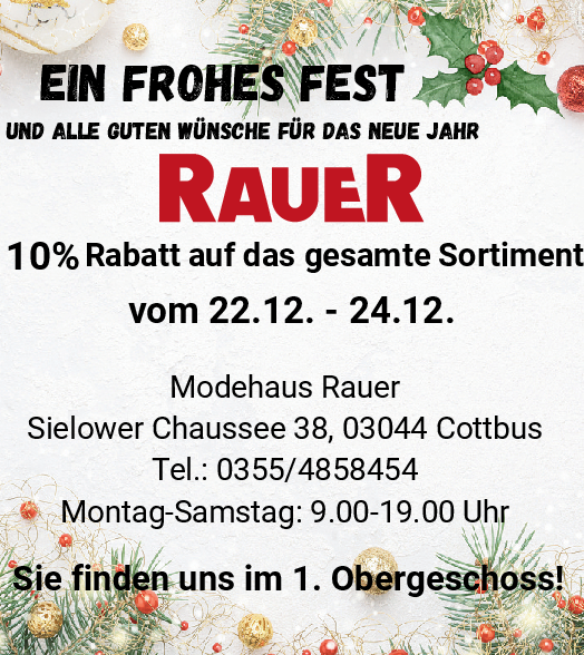 „Schauen Sie vorbei und finden auch Sie Ihr neues Lieblingsstück. Wir freuen uns auf Ihren Besuch im Cottbus Center.“ Sie wissen ja jetzt: Einfach mit der Rolltreppe rauf ins erste Obergeschoss zum Modehaus RAUER. pm/amr